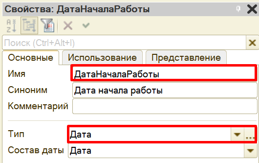Обратите внимание, что мы изменили синоним реквизита объекта конфигурации, а не реквизита формы.