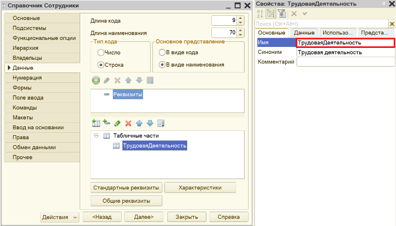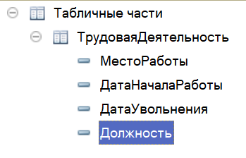 Эта информация однородна по своей структуре (организация, начало, окончание работы, занимаемая должность), но количество предыдущих мест работы у разных сотрудников может быть различным. Поэтому для хранения такой информации мы будем использовать табличную часть справочника.