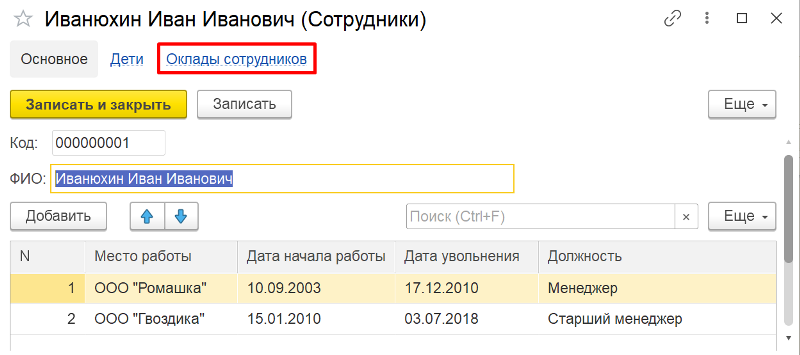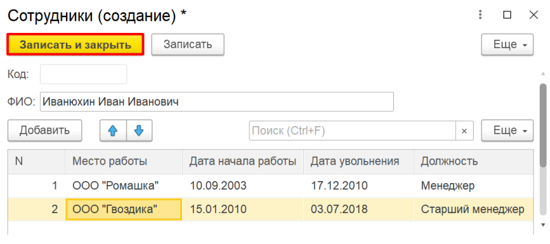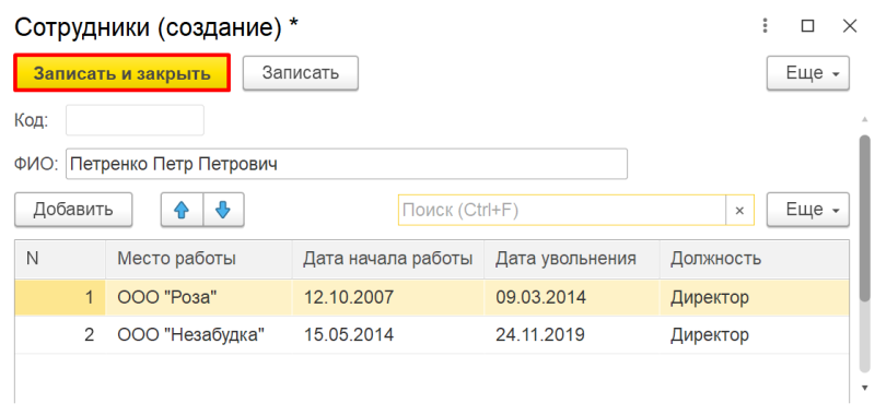 Этот справочник будет устроен несколько сложнее, чем справочник Клиенты. Дело в том, что в нем мы будем хранить не только фамилию, имя и отчество сотрудника, но и информацию о его прошлой трудовой деятельности.
