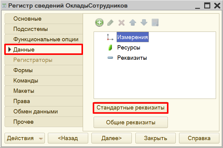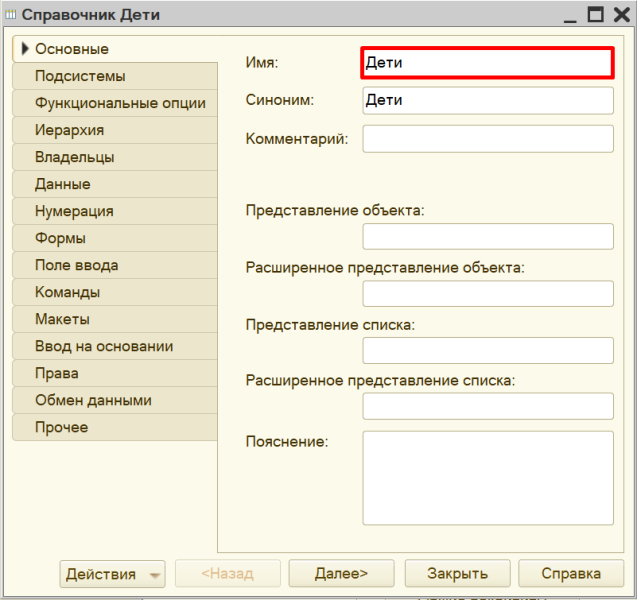 Теперь вернемся к окну редактирования объекта конфигурации Справочник и нажмем на закладку Данные.