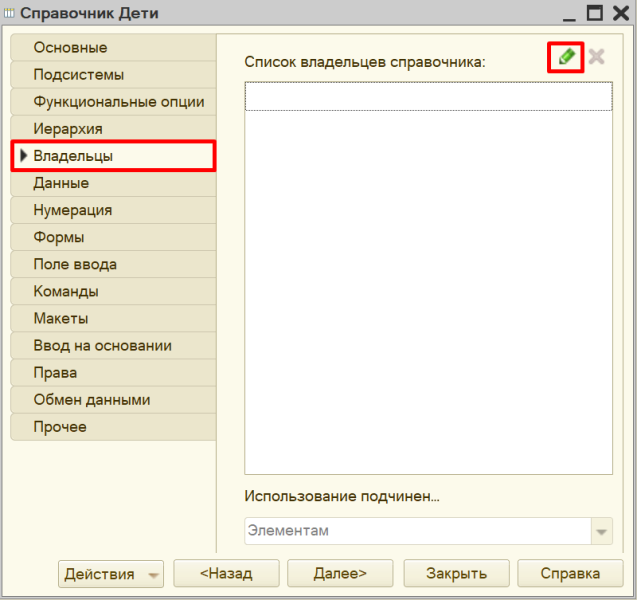 Нажмем кнопку Далее и перейдем на закладку Подсистемы окна редактирования объекта конфигурации Справочник.