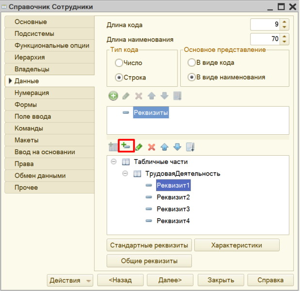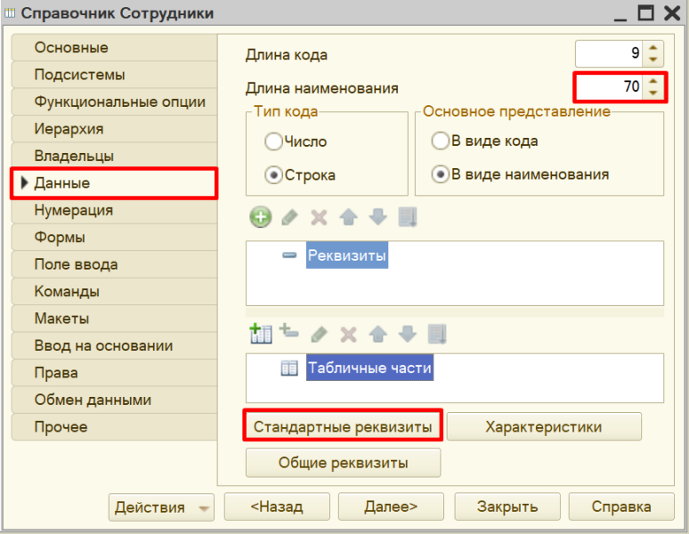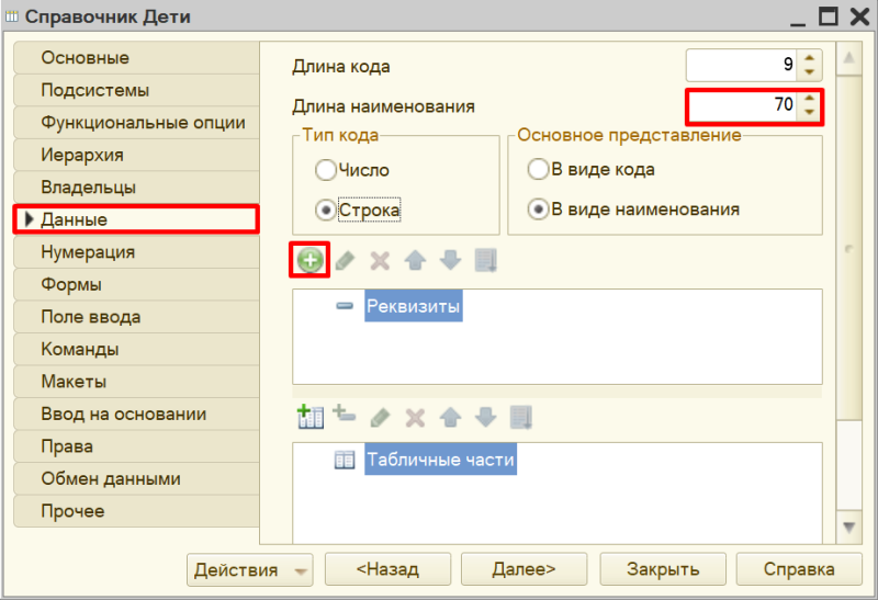 Перейдем на закладку Данные. Оставим по умолчанию длину и тип кода, длину наименования справочника зададим равной 50 символам.
