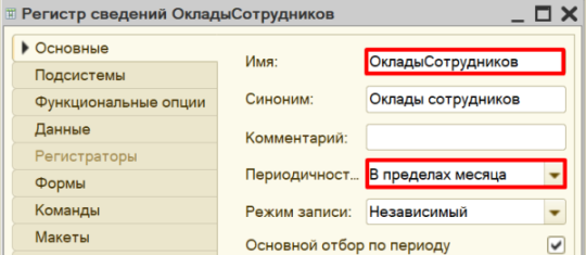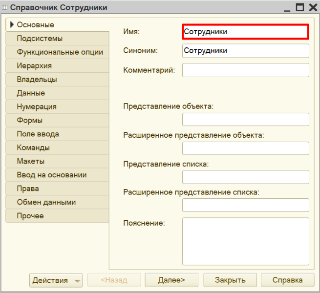 Здесь, также как и для предыдущего справочника, изменим свойство Синоним стандартного реквизита Наименование, так как речь идет о сотрудниках.